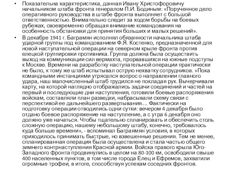 Слайд 13Показательна характеристика, данная Ивану Христофоровичу начальником штаба фронта генералом П.И. Бодиным: