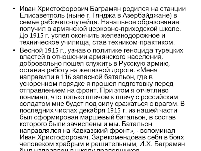 Слайд 3Иван Христофорович Баграмян родился на станции Елисаветполь (ныне г. Гянджа в