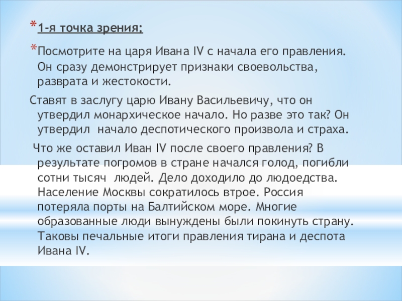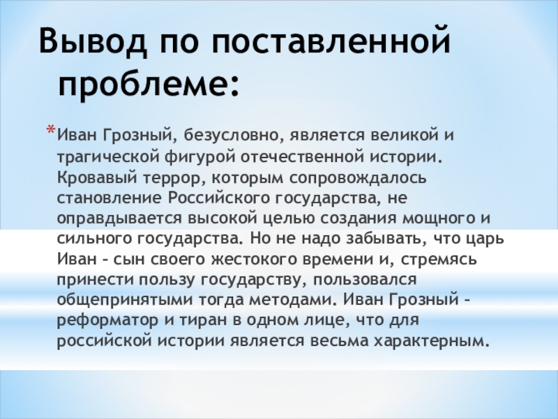 Грозного учитывать, что царь Иван – сын своего жестокого времени и, стремясь принести пользу государству, пользовался общепринятыми тогда методами?