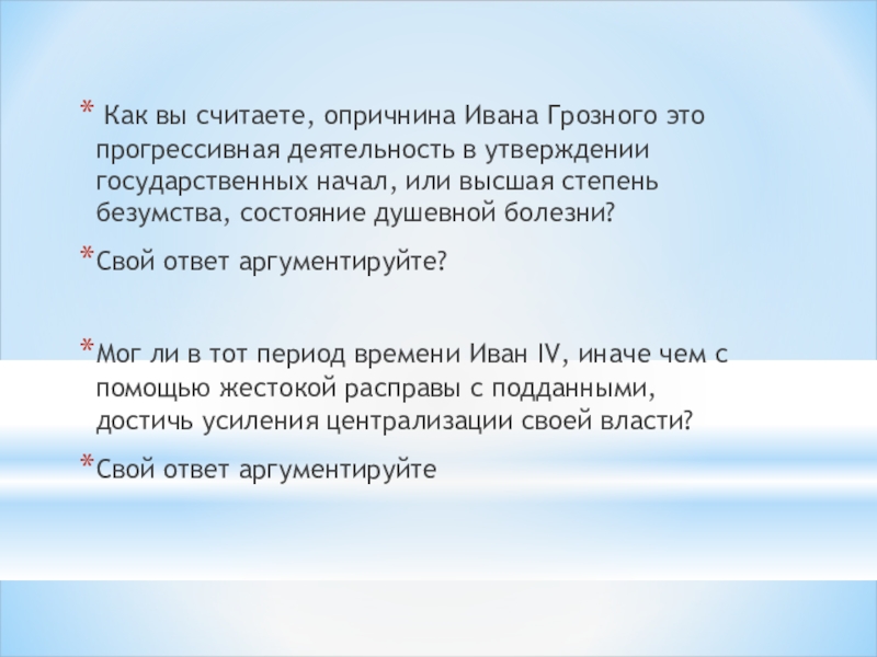 Как вы считаете, опричнина Ивана Грозного это прогрессивная деятельность