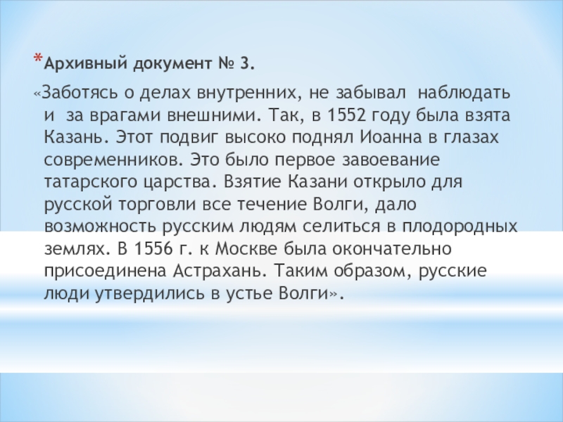 за врагами внешними. Так, в 1552 году была взята Казань. Этот подвиг высоко поднял Иоанна в глазах современников. Это было первое завоевание татарского царства. Взятие Казани открыло для русской торговли все течение Волги, дало возможность русским людям селиться в плодородных землях. В 1556 г. к Москве была окончательно присоединена Астрахань. Таким образом, русские люди утвердились в устье Волги».