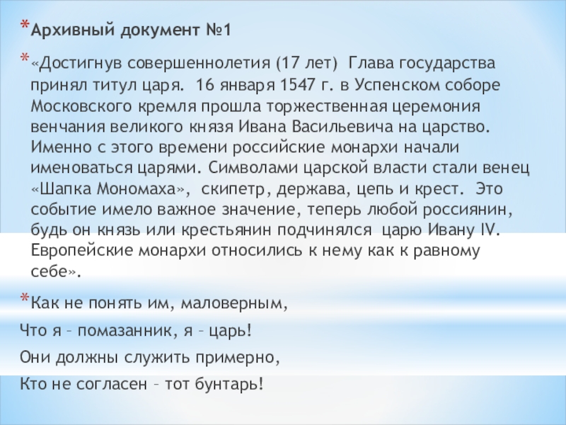 16 января 1547 г. в Успенском соборе Московского кремля прошла торжественная церемония венчания великого князя Ивана Васильевича на царство. Именно с этого времени российские монархи начали именоваться царями. Символами царской власти стали венец «Шапка Мономаха», скипетр, держава, цепь и крест. Это событие имело важное значение, теперь любой россиянин, будь он князь или крестьянин подчинялся царю Ивану IV. Европейские монархи относились к нему как к равному себе».