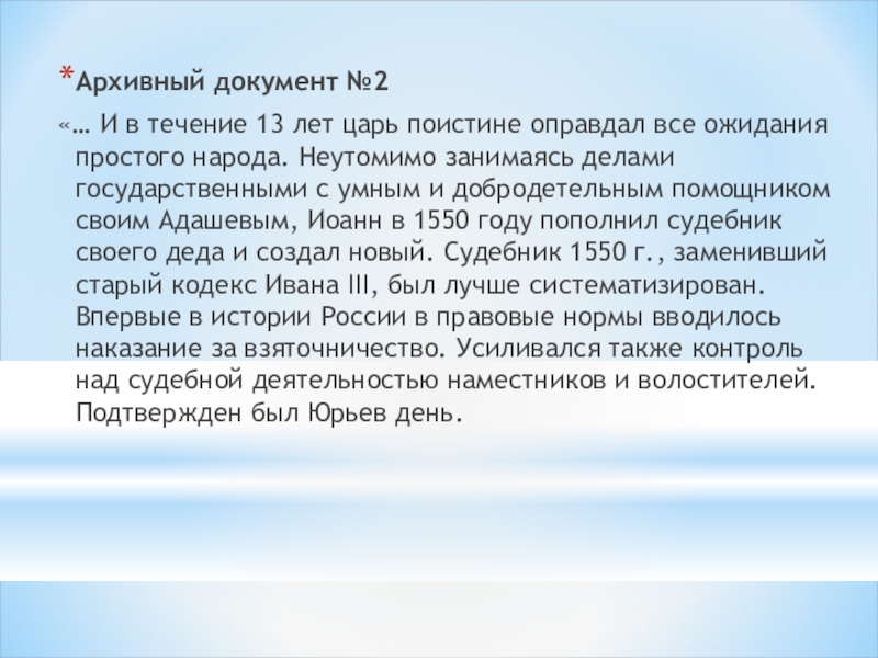 все ожидания простого народа. Неутомимо занимаясь делами государственными с умным и добродетельным помощником своим Адашевым, Иоанн в 1550 году пополнил судебник своего деда и создал новый. Судебник 1550 г., заменивший старый кодекс Ивана III, был лучше систематизирован. Впервые в истории России в правовые нормы вводилось наказание за взяточничество. Усиливался также контроль над судебной деятельностью наместников и волостителей. Подтвержден был Юрьев день.