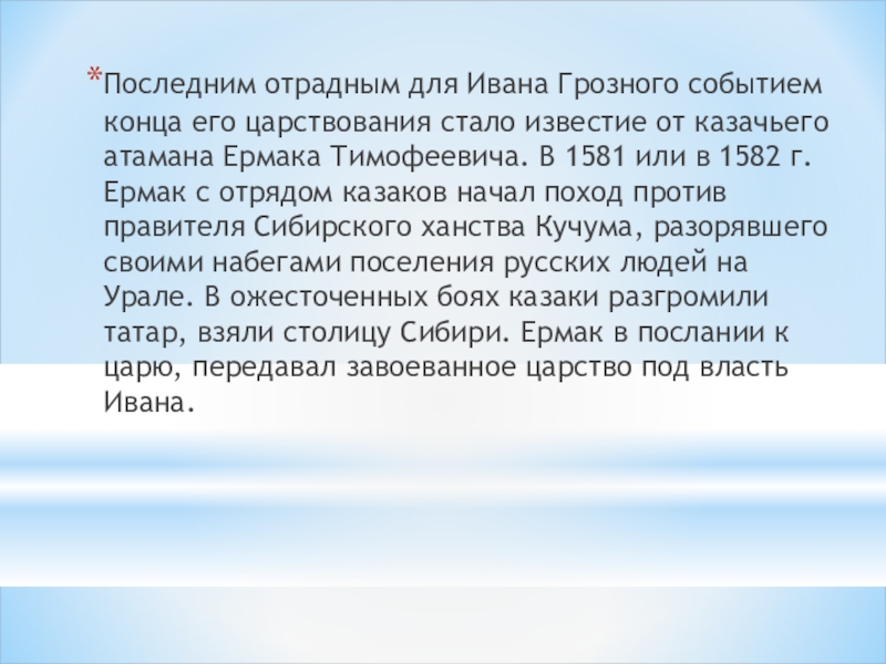 Слайд 20Последним отрадным для Ивана Грозного событием конца его царствования стало известие