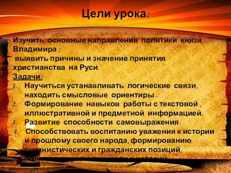 4. Способствовать воспитанию уважения к истории и прошлому своего народа, формированию гуманистических и гражданских позиций, пониманию роли личности в истории