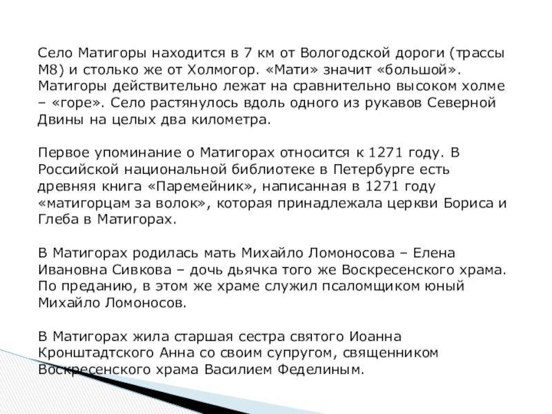 Слайд 3Село Матигоры находится в 7 км от Вологодской дороги (трассы М8)