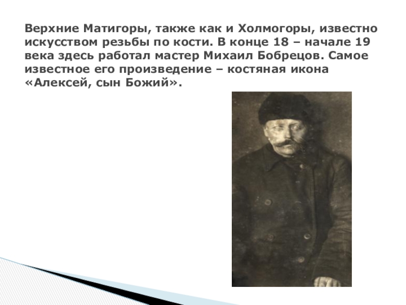 Слайд 7Верхние Матигоры, также как и Холмогоры, известно искусством резьбы по кости.