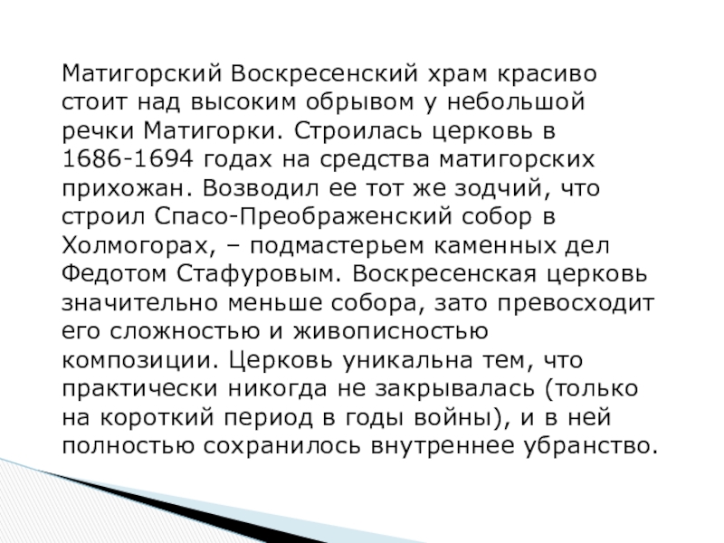 Слайд 5Матигорский Воскресенский храм красиво стоит над высоким обрывом у небольшой речки