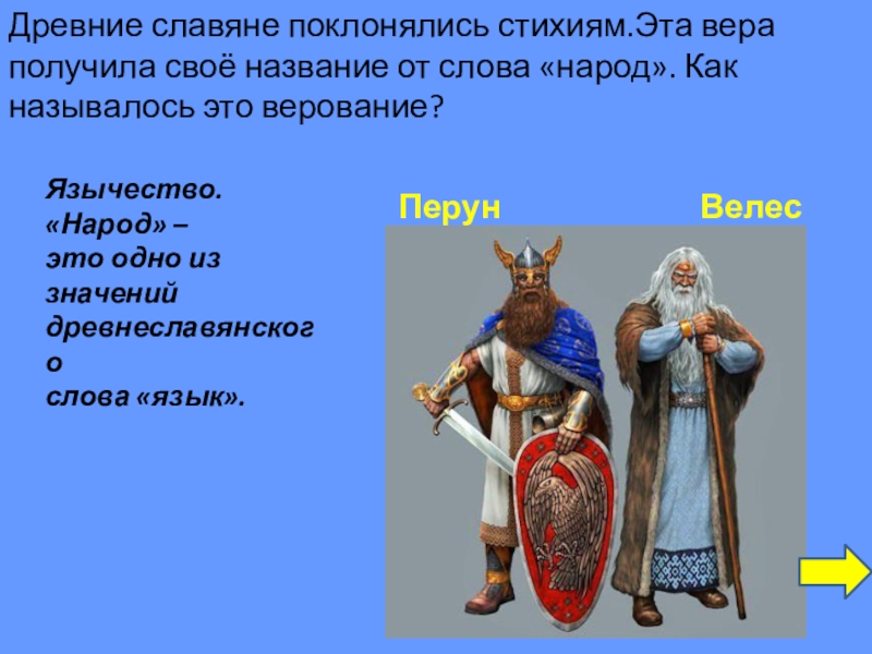 Древние славяне поклонялись стихиям.Эта вера получила своё название от слова «народ». Как называлось это верование?