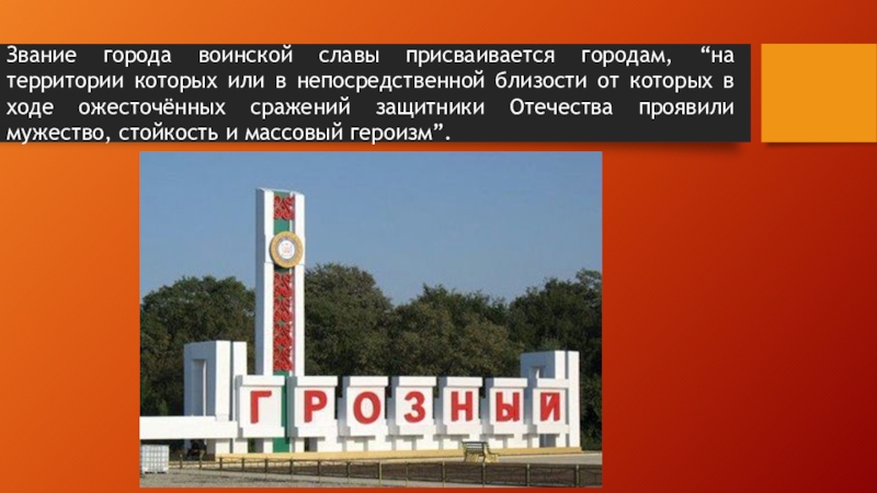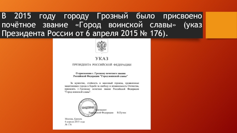 Слайд 2В 2015 году городу Грозный было присвоено почётное звание «Город воинской