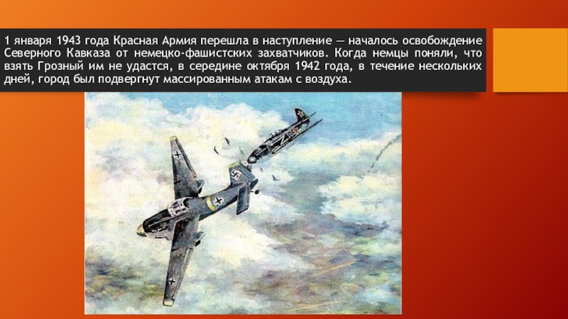 освобождение Северного Кавказа от немецко-фашистских захватчиков. Когда немцы поняли, что взять Грозный им не удастся, в середине октября 1942 года, в течение нескольких дней, город был подвергнут массированным атакам с воздуха.
