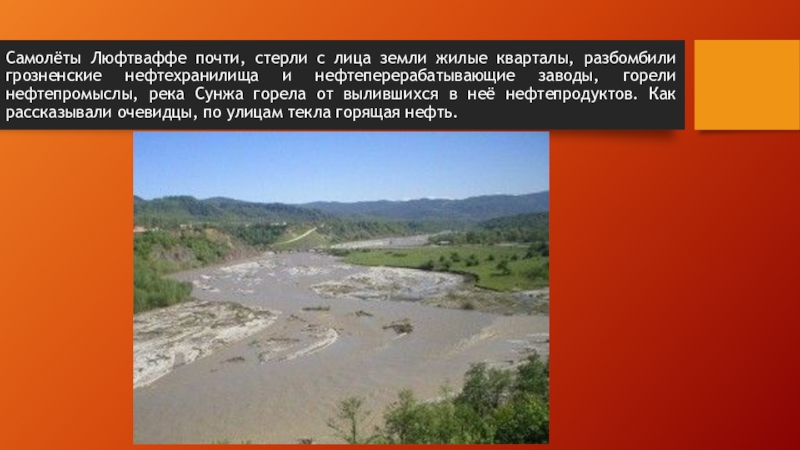 нефтехранилища и нефтеперерабатывающие заводы, горели нефтепромыслы, река Сунжа горела от вылившихся в неё нефтепродуктов. Как рассказывали очевидцы, по улицам текла горящая нефть.