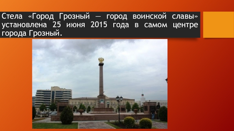 Слайд 20Стела «Город Грозный — город воинской славы» установлена 25 июня