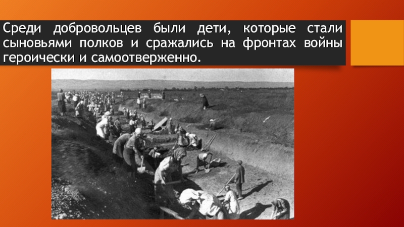Слайд 16Среди добровольцев были дети, которые стали сыновьями полков и сражались на