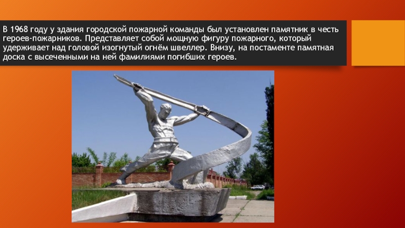 Слайд 19В 1968 году у здания городской пожарной команды был установлен памятник