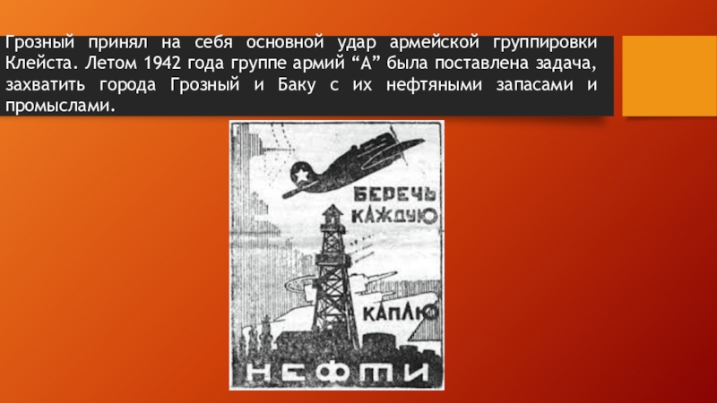 Слайд 6Грозный принял на себя основной удар армейской группировки Клейста. Летом 1942