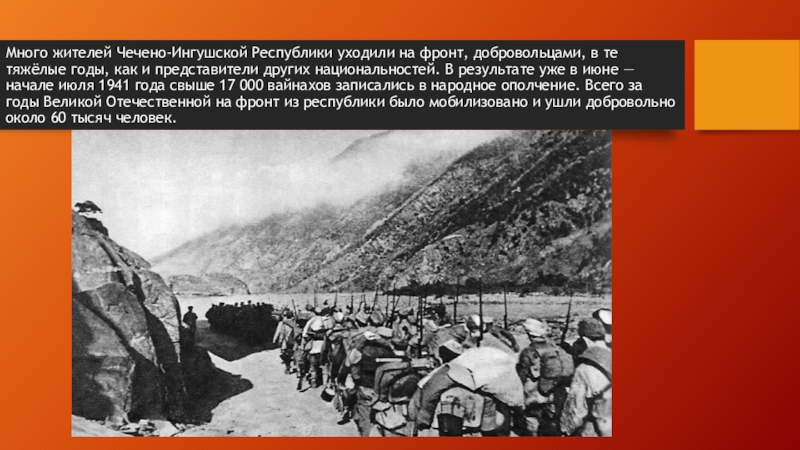Слайд 15Много жителей Чечено-Ингушской Республики уходили на фронт, добровольцами, в те тяжёлые