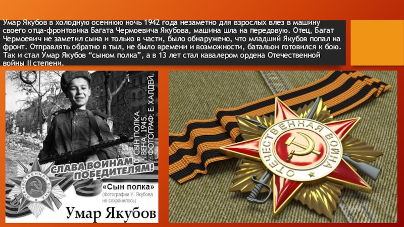 влез в машину своего отца-фронтовика Багата Чермоевича Якубова, машина шла на передовую. Отец, Багат Чермоевич не заметил сына и только в части, было обнаружено, что младший Якубов попал на фронт. Отправлять обратно в тыл, не было времени и возможности, батальон готовился к бою. Так и стал Умар Якубов “сыном полка”, а в 13 лет стал кавалером ордена Отечественной войны II степени.