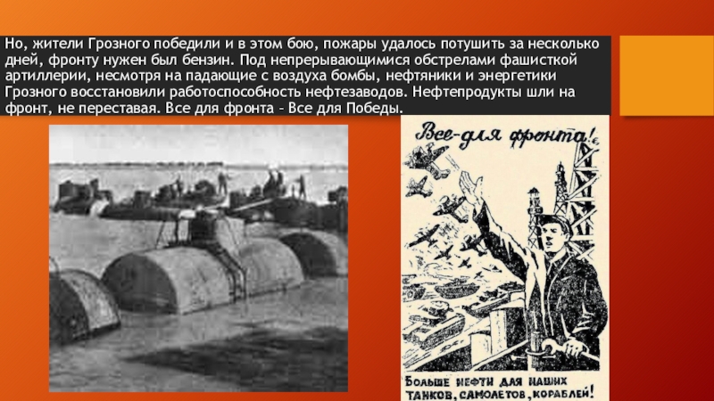 за несколько дней, фронту нужен был бензин. Под непрерывающимися обстрелами фашисткой артиллерии, несмотря на падающие с воздуха бомбы, нефтяники и энергетики Грозного восстановили работоспособность нефтезаводов. Нефтепродукты шли на фронт, не переставая. Все для фронта – Все для Победы.
