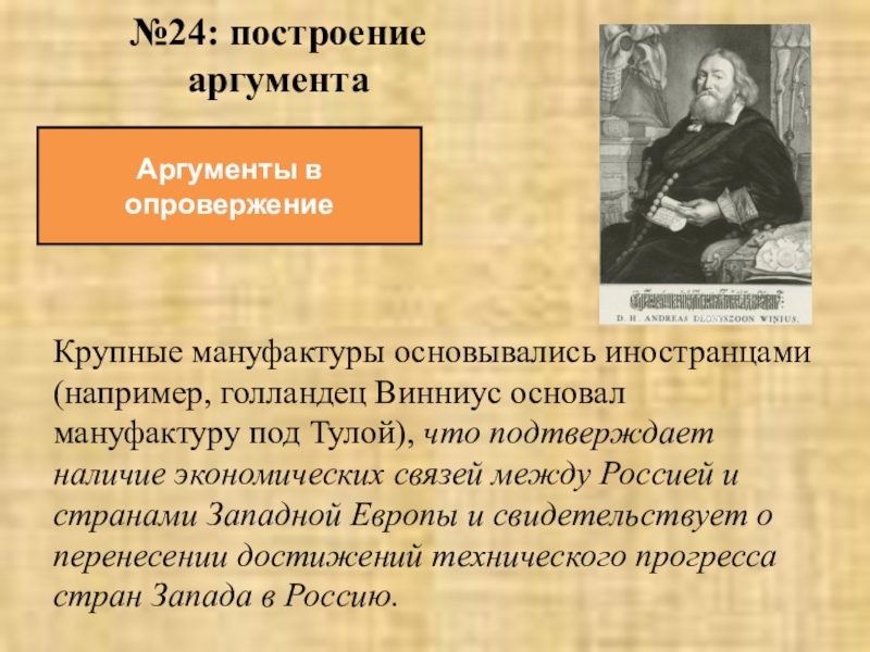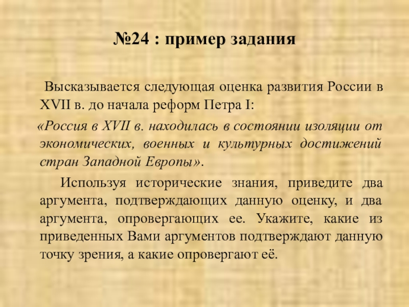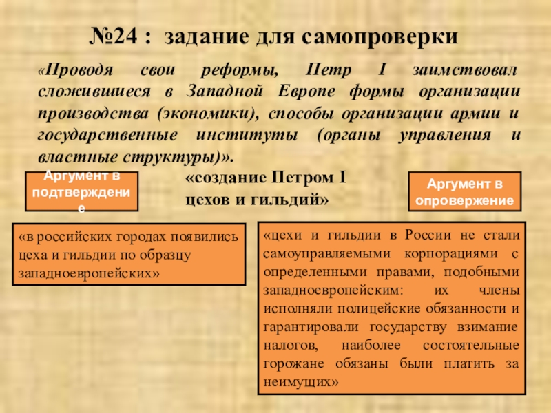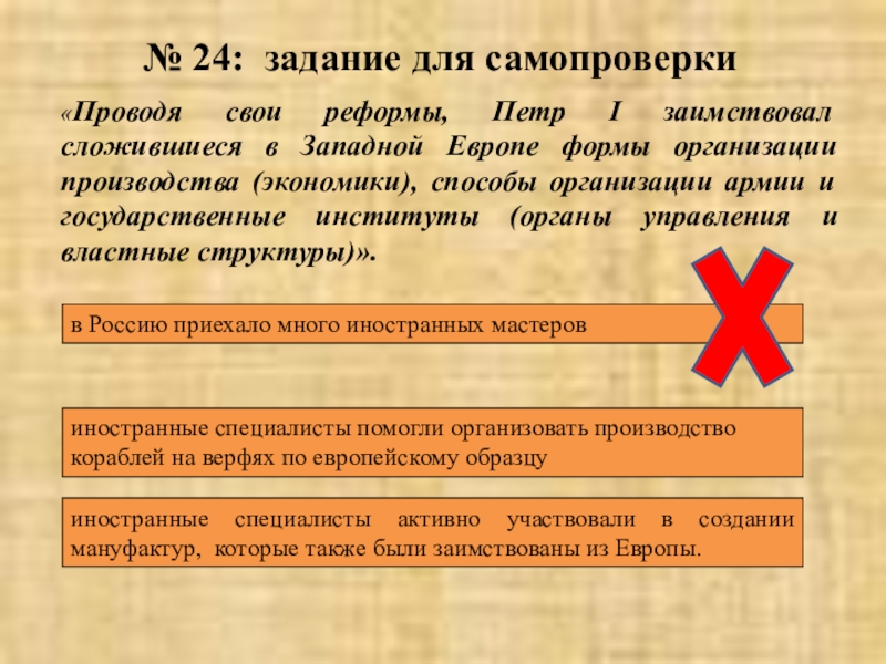 «Проводя свои реформы, Петр I заимствовал сложившиеся в Западной Европе формы организации производства (экономики), способы организации армии и государственные институты (органы управления и властные структуры)».