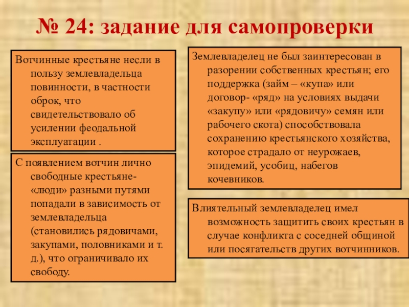 С появлением вотчин лично свободные крестьяне- «люди» разными путями попадали в зависимость от землевладельца (становились рядовичами, закупами, половниками и т.д.), что ограничивало их свободу.
