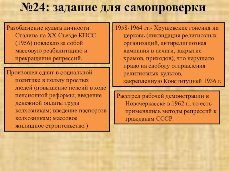 1958-1964 гг.- Хрущевские гонения на церковь (ликвидация религиозных организаций, антирелигиозная кампания в печати, закрытие храмов, приходов), что нарушало право на свободу отправления религиозных культов, закрепленную Конституцией 1936 г.