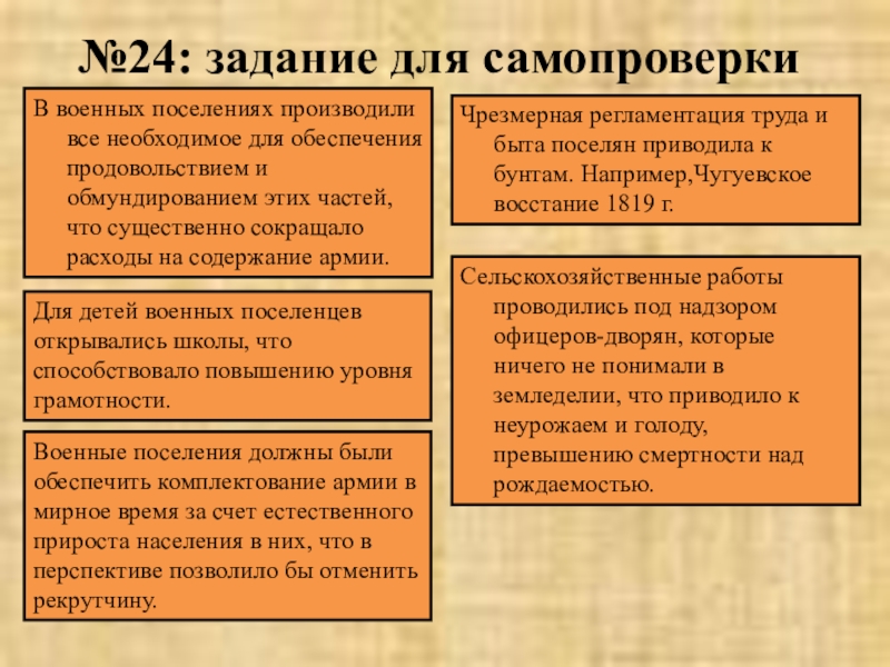 Чрезмерная регламентация труда и быта поселян приводила к бунтам. Например,Чугуевское восстание 1819 г.