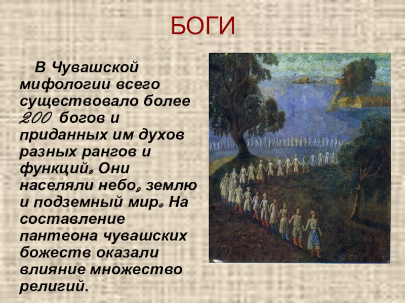всего существовало более 200 богов и приданных им духов разных рангов и функций. Они населяли небо, землю и подземный мир. На составление пантеона чувашских божеств оказали влияние множество религий.