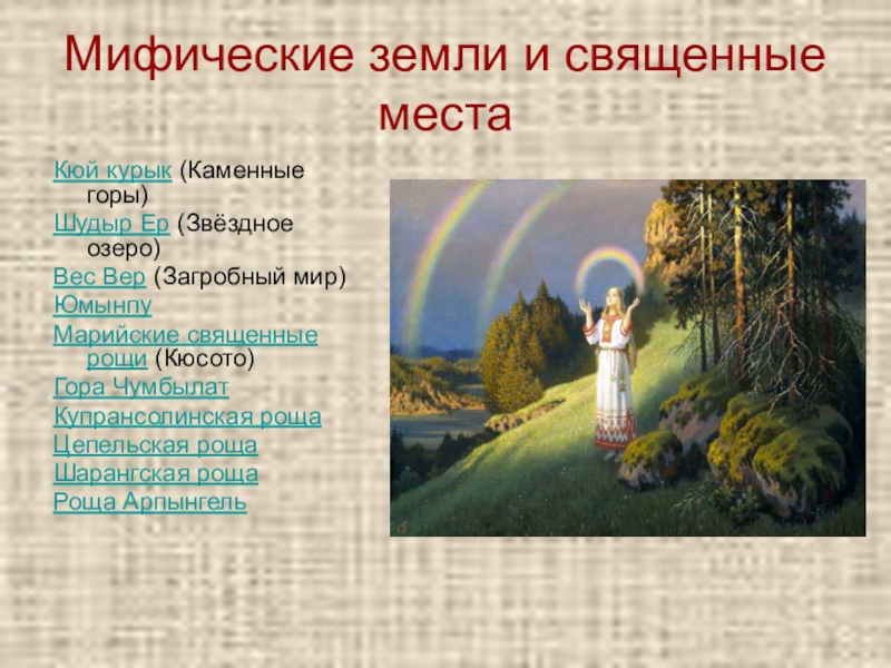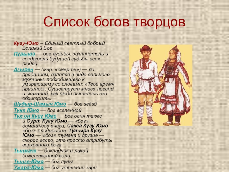 должен почитать и уважать. До начала распространения монотеистических учений марийцы почитали многих богов известных под названием Юмо, признавая при этом главенство Верховного Бога (Кугу-Юмо). В XIX веке языческие верования, под влиянием монотеистических воззрений их соседей, видоизменились и был создан образ Единого Бога Тÿҥ Ош Поро Кугу Юмо (Единый Светлый Добрый Великий Бог).