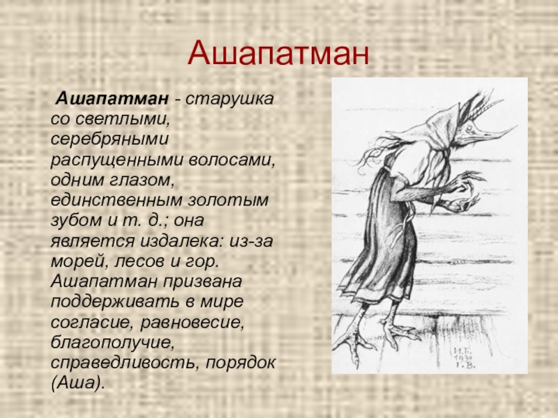 одним глазом, единственным золотым зубом и т. д.; она является издалека: из-за морей, лесов и гор. Ашапатман призвана поддерживать в мире согласие, равновесие, благополучие, справедливость, порядок (Аша).