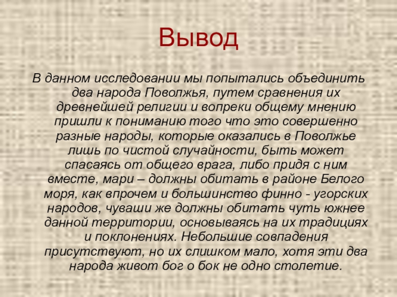 их древнейшей религии и вопреки общему мнению пришли к пониманию того что это совершенно разные народы, которые оказались в Поволжье лишь по чистой случайности, быть может спасаясь от общего врага, либо придя с ним вместе, мари – должны обитать в районе Белого моря, как впрочем и большинство финно - угорских народов, чуваши же должны обитать чуть южнее данной территории, основываясь на их традициях и поклонениях. Небольшие совпадения присутствуют, но их слишком мало, хотя эти два народа живот бог о бок не одно столетие.