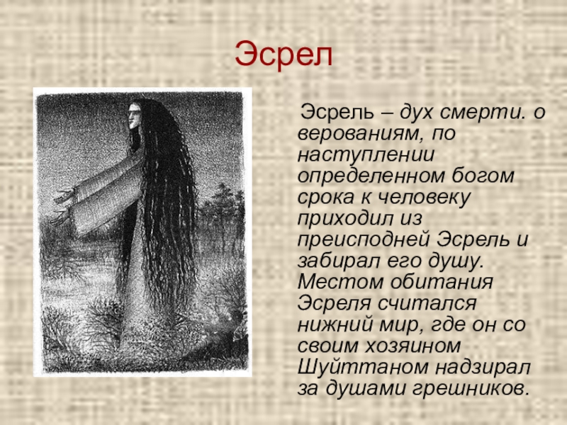 определенном богом срока к человеку приходил из преисподней Эсрель и забирал его душу. Местом обитания Эсреля считался нижний мир, где он со своим хозяином Шуйттаном надзирал за душами грешников.