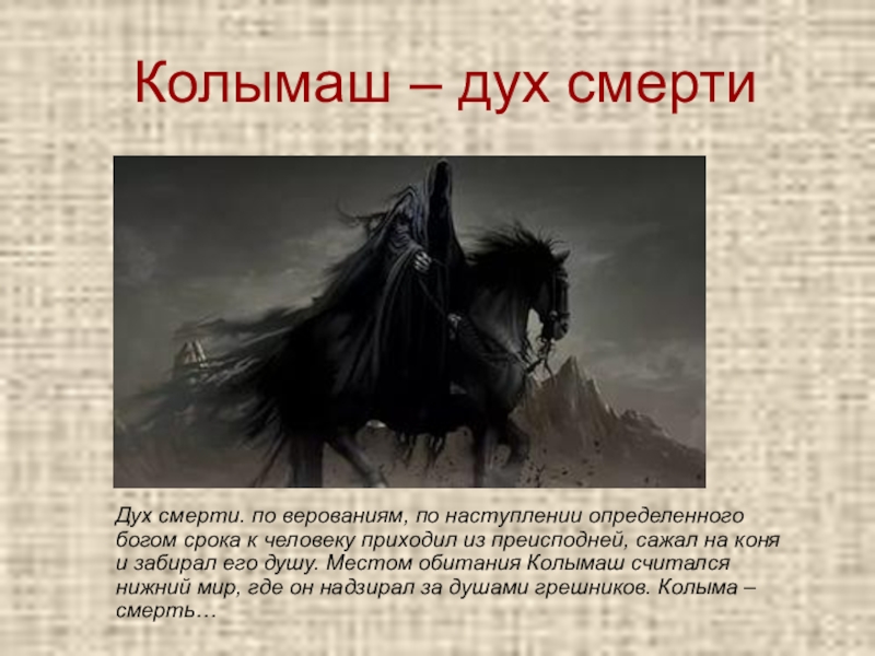 наступлении определенного богом срока к человеку приходил из преисподней, сажал на коня и забирал его душу. Местом обитания Колымаш считался нижний мир, где он надзирал за душами грешников. Колыма – смерть…