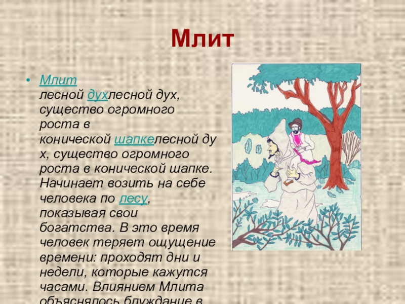 в конической шапке. Начинает возить на себе человека по лесу, показывая свои богатства. В это время человек теряет ощущение времени: проходят дни и недели, которые кажутся часами. Влиянием Млита объяснялось блуждание в лесу и потеря памяти.