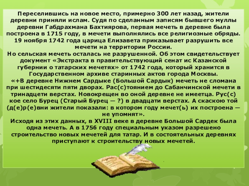 «+В деревне Нижнем Сардыке (Большой Сардык) мечеть не сломана при шестидесяти пяти дворах. Рас(с)тоянием до Сабанчинской мечети в тринадцети верстах. Новокрещен во оной деревне не имеетца. Рус(с)кое село Бурец (Старый Бурец — ?) в двадцати верстах. А скаскою той (д(е)р(е)вни жители показали: в котором году мечет(ь) их построена — не упомнят».
