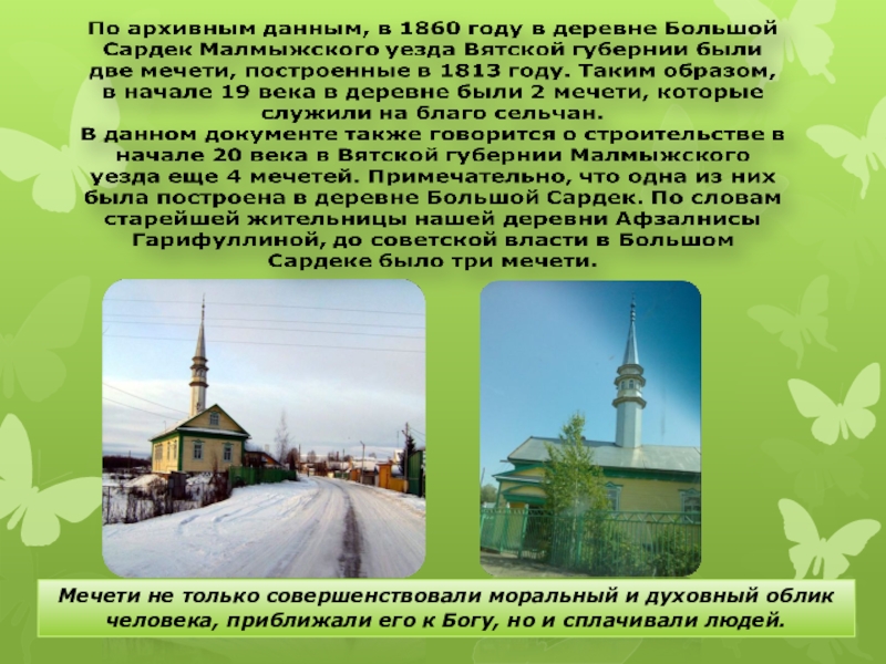 Исходя из этих данных, в XVIII веке в деревне Большой Сардек была одна мечеть. А в 1756 году специальным указом разрешено строительство новых мечетей для татар. И в состоятельных деревнях приступают к строительству новых мечетей.