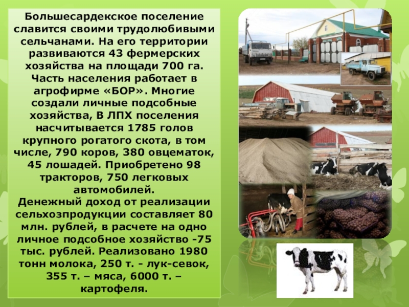 Слайд 15Большесардекское поселение славится своими трудолюбивыми сельчанами. На его территории развиваются 43