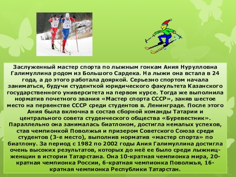 Слайд 18Заслуженный мастер спорта по лыжным гонкам Ания Нурулловна Галимуллина родом из