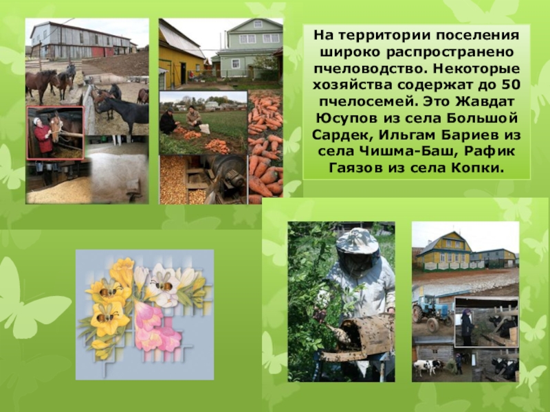 Слайд 16На территории поселения широко распространено пчеловодство. Некоторые хозяйства содержат до 50
