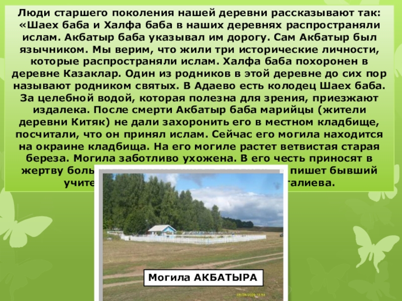 баба в наших деревнях распространяли ислам. Акбатыр баба указывал им дорогу. Сам Акбатыр был язычником. Мы верим, что жили три исторические личности, которые распространяли ислам. Халфа баба похоронен в деревне Казаклар. Один из родников в этой деревне до сих пор называют родником святых. В Адаево есть колодец Шаех баба. За целебной водой, которая полезна для зрения, приезжают издалека. После смерти Акбатыр баба марийцы (жители деревни Китяк) не дали захоронить его в местном кладбище, посчитали, что он принял ислам. Сейчас его могила находится на окраине кладбища. На его могиле растет ветвистая старая береза. Могила заботливо ухожена. В его честь приносят в жертву большого откормленного барана», — пишет бывший учитель истории Халима апа Мухаметгалиева.