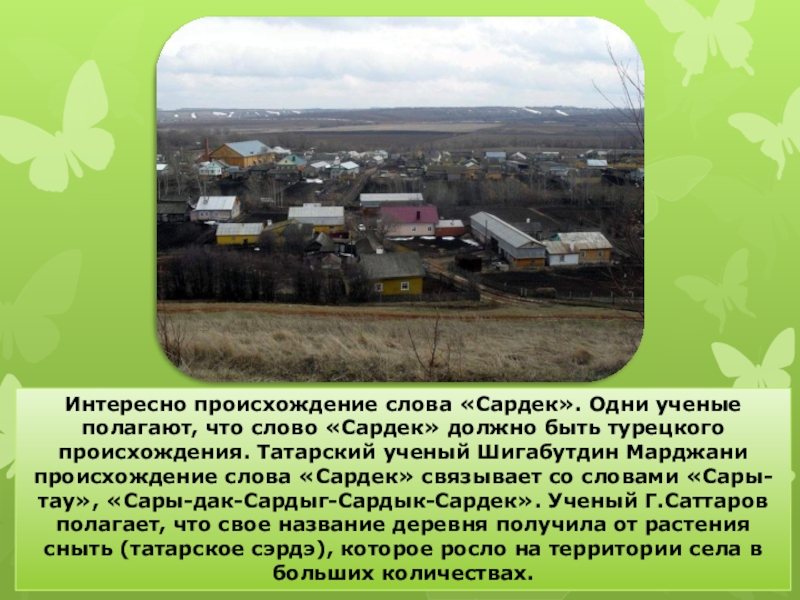быть турецкого происхождения. Татарский ученый Шигабутдин Марджани происхождение слова «Сардек» связывает со словами «Сары-тау», «Сары-дак-Сардыг-Сардык-Сардек». Ученый Г.Саттаров полагает, что свое название деревня получила от растения сныть (татарское сэрдэ), которое росло на территории села в больших количествах.