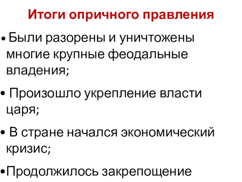 Итоги опричного правления Были разорены и уничтожены многие крупные феодальные владения; Произошло укрепление власти царя; В стране
