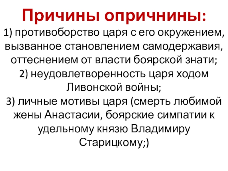 3) личные мотивы царя (смерть любимой жены Анастасии, боярские симпатии к удельному князю Владимиру Старицкому;)