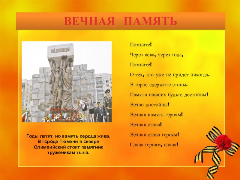 В городе Тюмени в сквере Олимпийский стоит памятник труженикам тыла.