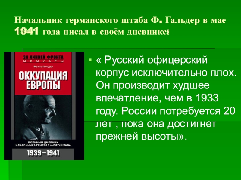 « Русский офицерский корпус исключительно плох. Он производит худшее впечатление, чем в 1933 году. России потребуется 20 лет , пока она достигнет прежней высоты».