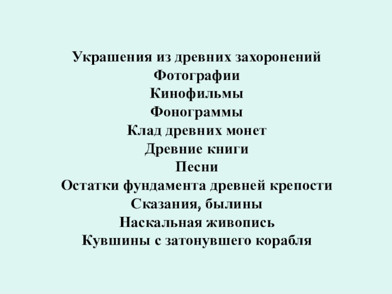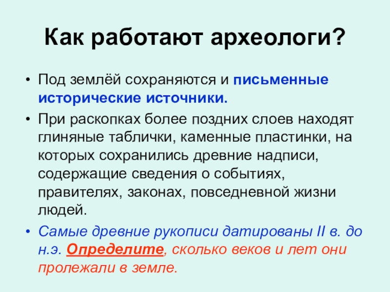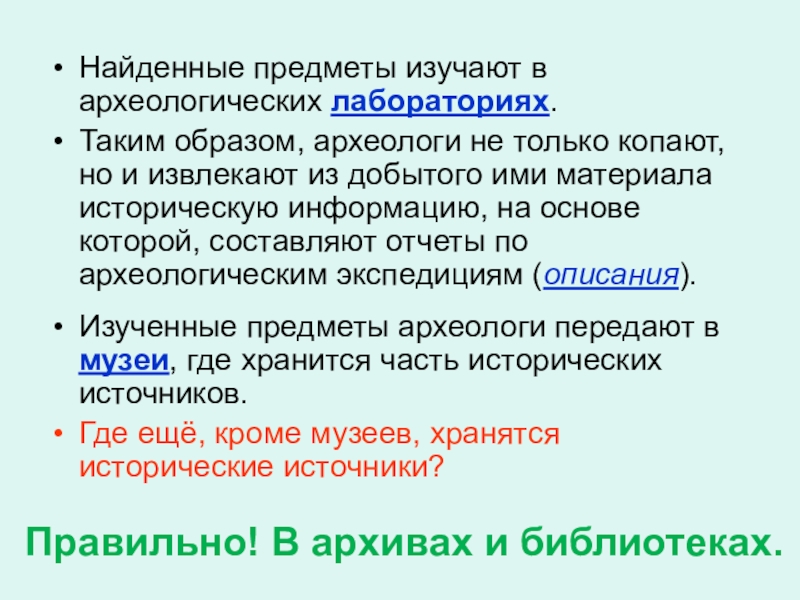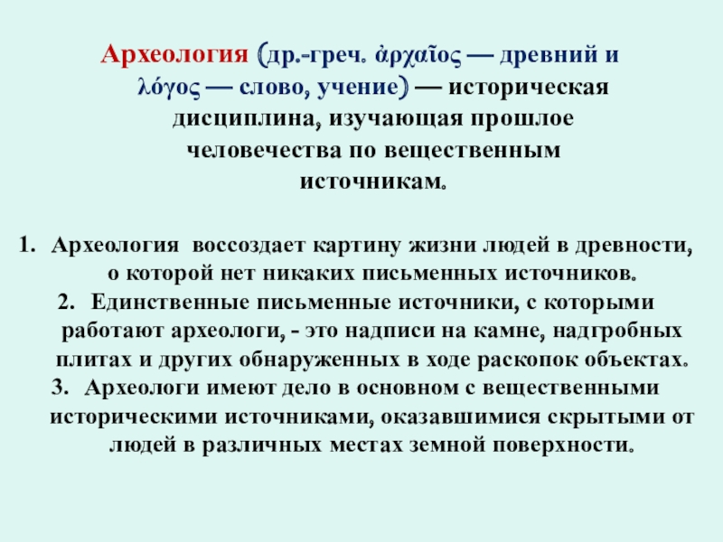 Археологи имеют дело в основном с вещественными историческими источниками, оказавшимися скрытыми от людей в различных местах земной поверхности.