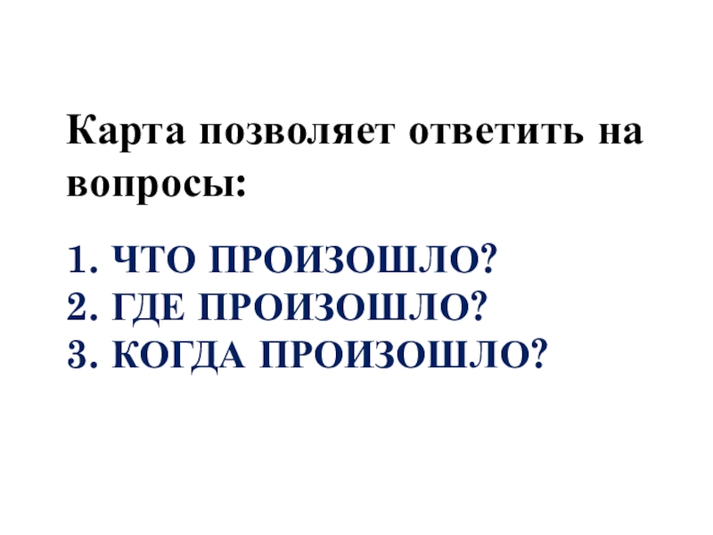 Карта позволяет ответить на вопросы:1. ЧТО ПРОИЗОШЛО?2. ГДЕ ПРОИЗОШЛО?3. КОГДА ПРОИЗОШЛО?