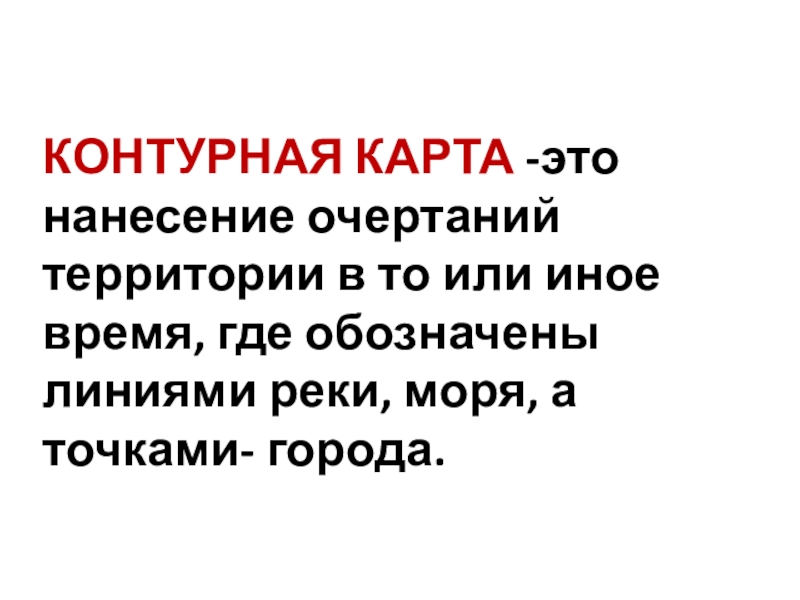 КОНТУРНАЯ КАРТА -это нанесение очертаний территории в то или иное время, где обозначены линиями реки, моря, а