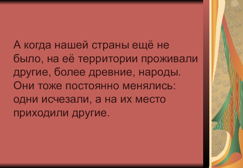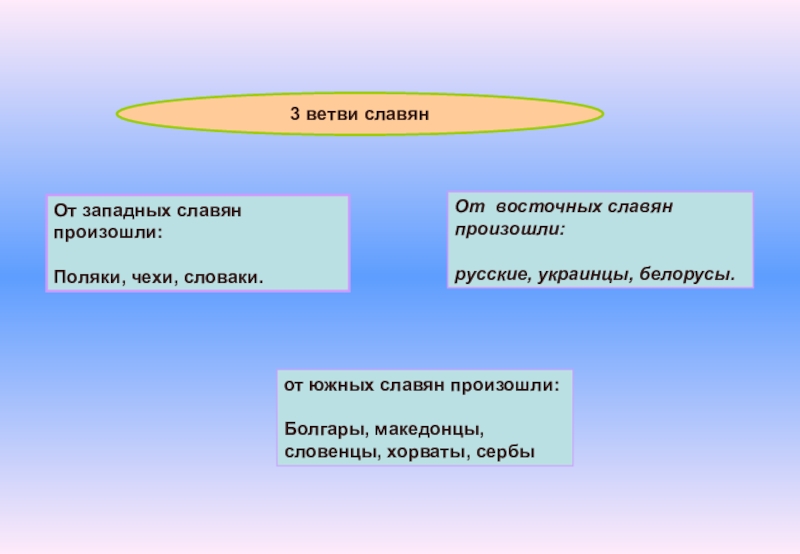 Третья часть славян пошла на северо-восток, расселилась по реке Днепру и его притокам, возле озера Ильмень и реки Волхов. Эти славяне называются восточные славяне. От них ведет начало русский, украинский и белорусский народы.