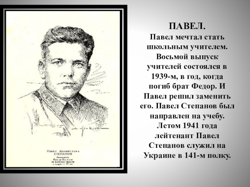 в год, когда погиб брат Федор. И Павел решил заменить его. Павел Степанов был направлен на учебу. Летом 1941 года лейтенант Павел Степанов служил на Украине в 141-м полку.